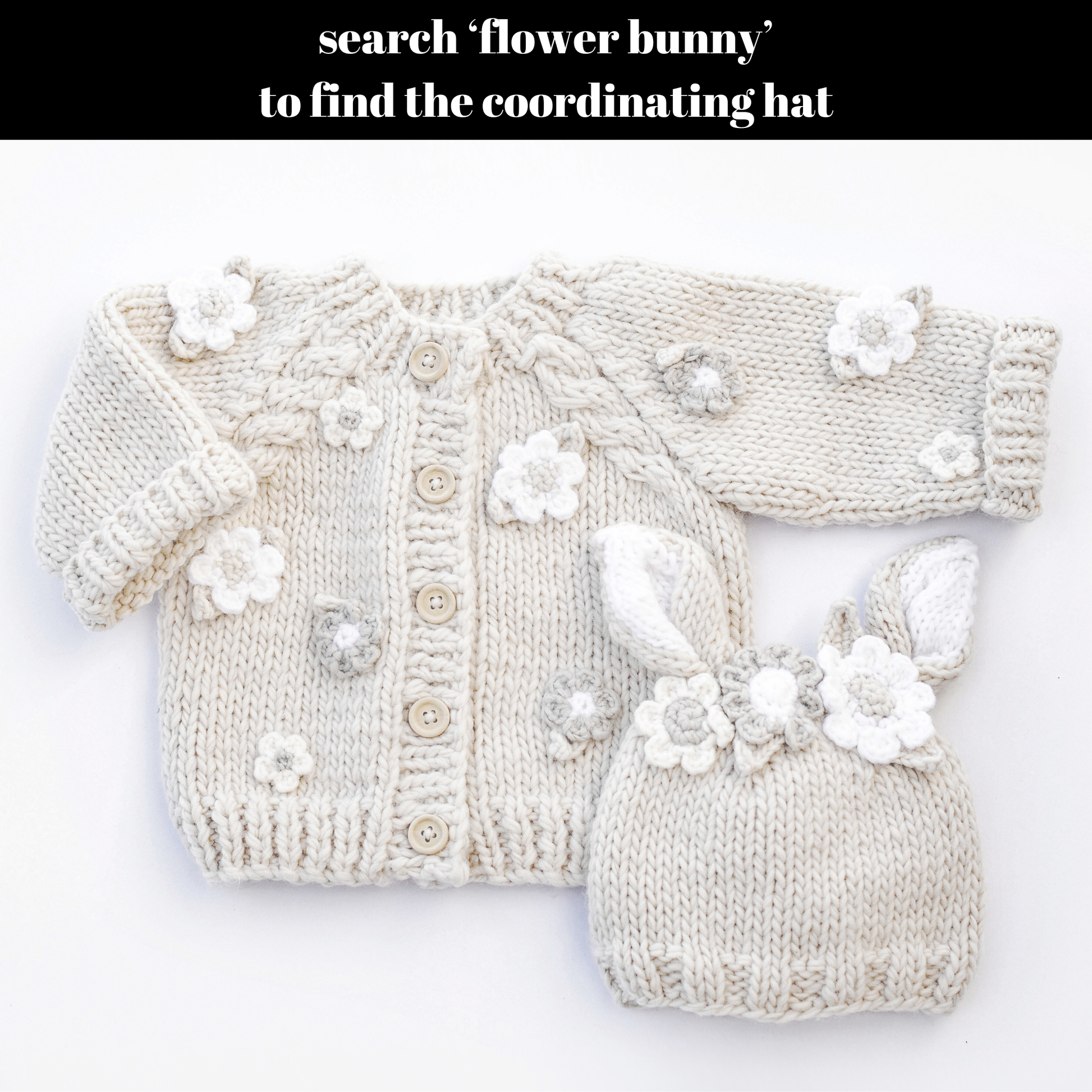 This Natural hued cardigan features hand-knit detailing and natural wood buttons. Not only is it adorned with beautiful crocheted flowers, but the raglan sleeves also have cable knit accents. Add our matching Flower Bunny Beanie for a cute and cozy look.