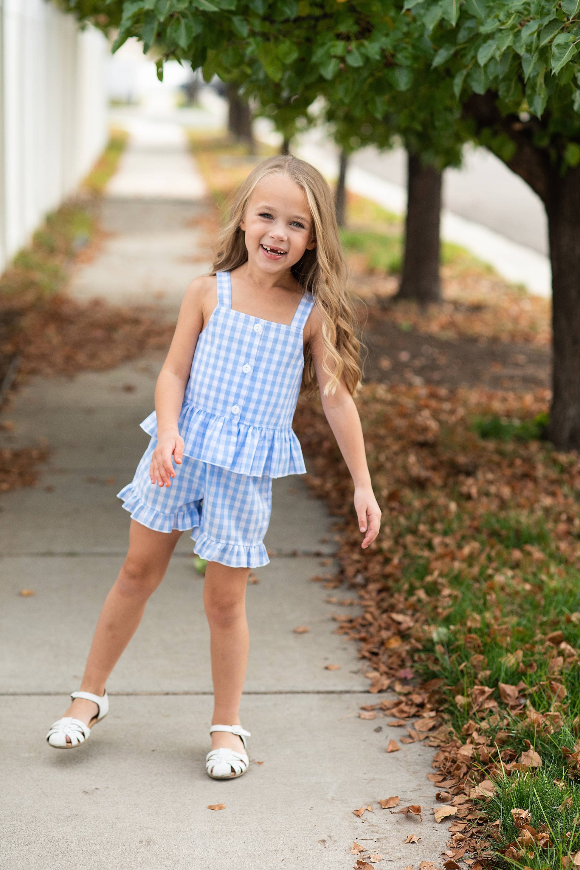Girls blue & white gingham check sleeveless ruffle top with button front. Ruffle shorts with elastic waistband. Perfect for Spring Summer Easter days! 100% Cotton
