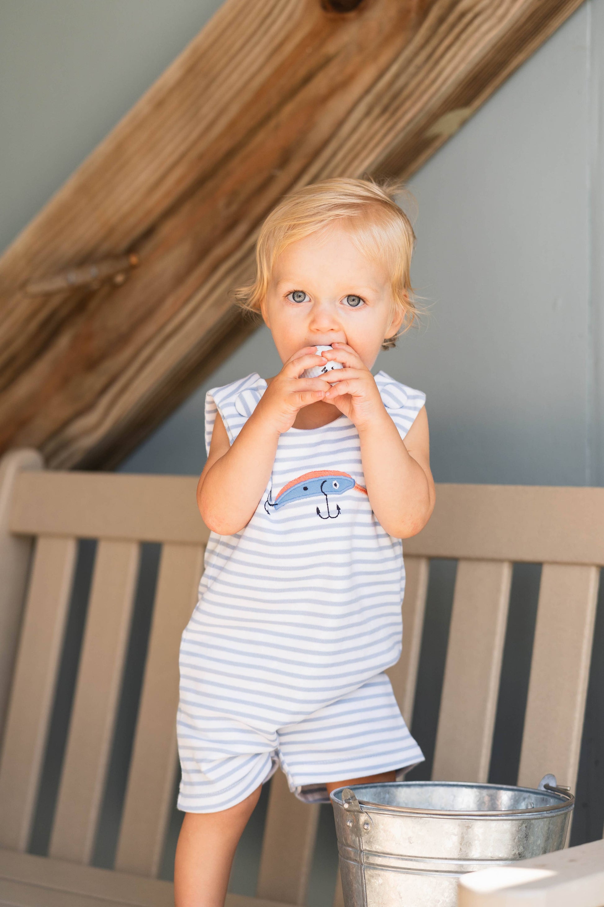 Cast a line for cuteness with the Lures Shortall! This sweet blue stripe one-piece is perfect for little ones who are born to fish! Featuring a fun fishing lure applique and practical details like snaps in the seat that make it as functional as it is adorable.